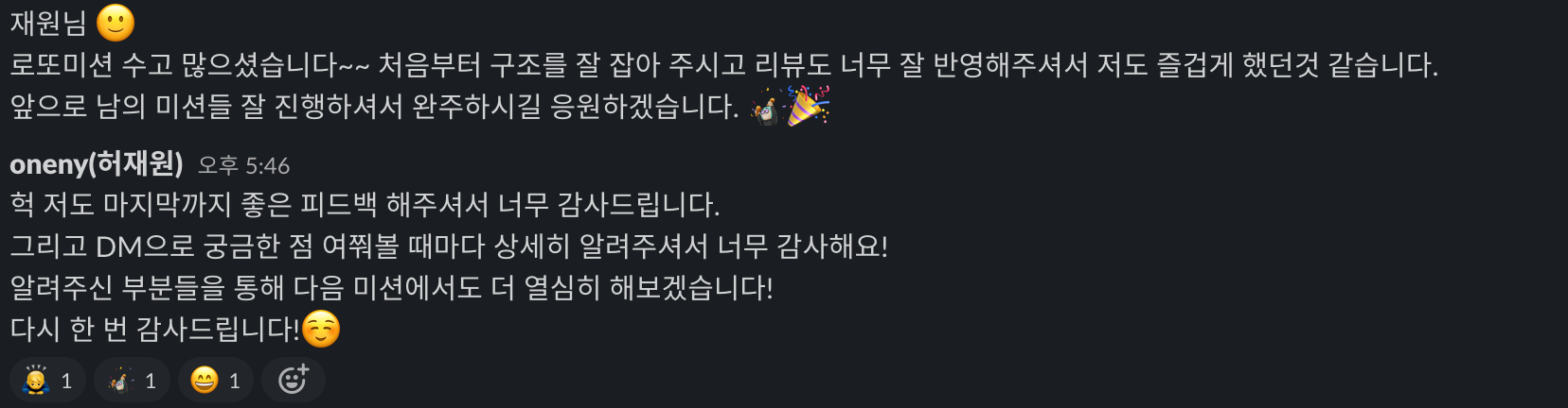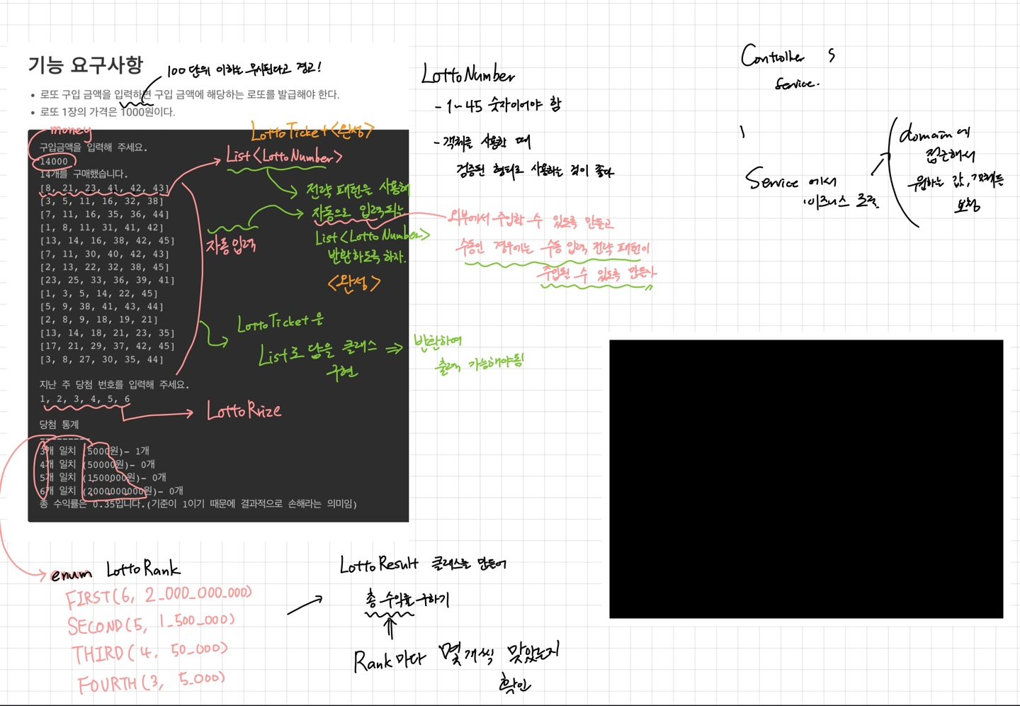 레이싱카 미션일 때는 어떻게 구현해야할지 감도 안잡힌 상황이였다면 똑같은 실수를 반복하지 않기 위해 이번에는 위 사진처럼 굿노트에 먼저 어떻게 구조를 잡을지 적어도 이틀은 고민하고 적고 지우고 고민하고를 반복한 것 같다. 구현할 때는 저렇게 작성한 것과는 또 다르게 수정하면서 미션을 수행했는데 그래도 이렇게 열심히 고심한 덕분인지 리뷰어 분께서 로또 미션을 전부 완료하고 직접 DM을 보내주셨을때 처음부터 구조를 잘 잡았다고 칭찬해주셨다. 그 칭찬이 나한테는 정말 너무 큰 보상이였다! 그리고 리뷰 해주신 것에 대해 하나하나 다 반영하고, 미션을 진행하면서 궁금한 부분들을 계속 DM으로 여쭤보는데 리뷰어 분을 귀찮게 하지 않았나 조금 걱정이였는데 리뷰어 분도 즐겁게 했다고 하셔서 다행이라 생각했고 너무 감사했다!