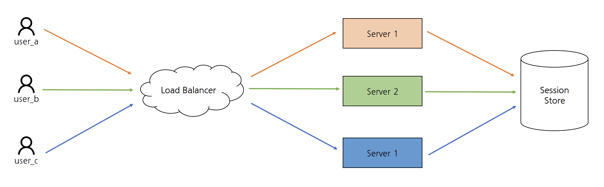 세션을 외부 스토어로 분리하는 작업은 외부 데이터베이스를 사용하여 세션을 관리하는 방식을 말한다. 이러한 방식은 Sticky Session처럼 한 서버에서 트래픽 부담할 상황이 일어나지 않고, 서버를 추가하더라도 세션 스토어를 통해 공유하기 때문에 서버들끼리 서로 네트워크하지 않고, 서버 메모리에 부담없이 확장할 수 있다는 이점이 있다.
