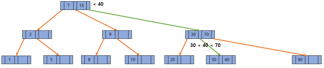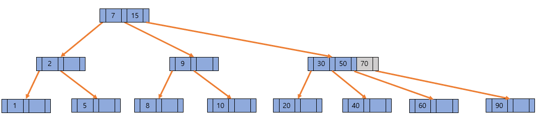 데이터 삽입의 대표적인 특징은 항상 leaf 노드에서 발생하고, 노드가 넘치면 가운데 key를 기준으로 좌우 key들을 분할하고 가운데 key는 승진시킨다는 것이다. 위 그림처럼 40 데이터가 삽입되었다고 가정해보자. 그러면 루트 노트에서 7과 15를 비교했을 때 둘 보다 크기 때문에 가장 오른쪽으로 30과 70을 비교했을때는 가운로 이동하여 키가 50과 60이 있는 노드로 이동할 것이다.