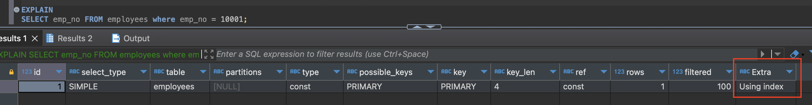 데이터 파일을 전혀 읽지 않고 인덱스만 읽어서 쿼리를 모두 처리할 수 있을 때 Extra 컬럼에 "Using index"가 표시된다. 이렇게 인덱스만으로 처리되는 것을 "커버링 인덱스( Covering index)"라고 한다. 인덱스를 사용해 조회하게 되면 실제 데이터까지 접근할 필요가 없어 조회 성능을 향상시킬 수 있다. 여기서 쿼리를 충족시킨다는 것은 SELECT, WHERE, GROUP BY, LIMIT, GROUP BY 등에서 사용되는 모든 컬럼이 인덱스 컬럼 안에 다 포함되는 경우를 말한다.