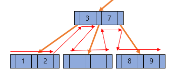 그러면 B-Tree에서는 위와 같은 구조를 가질 수 있을까? B-Tree는 internal 노드의 key 수가 x 개라면 자녀 노드의 수는 언제나 (x + 1)개이므로 현재 부모 노드의 수는 2개인데 자녀 노드의 수도 2개이기 때문에 규칙을 위반하므로 위와 같은 구조를 절대 가질 수 없다. 그리고 키가 하나인 경우에도 자식 노드가 2개이어야 하므로 3개인 경우에는 규칙을 위반한다고 할 수 있다. 따라서 키가 2개일 때에는 제일 처음 B-Tree 그림처럼 자녀 노드가 3개인 경우 또는 키가 1개일 때는 자녀 노드가 2개인 경우에 B-Tree 구조가 되는 것이다.