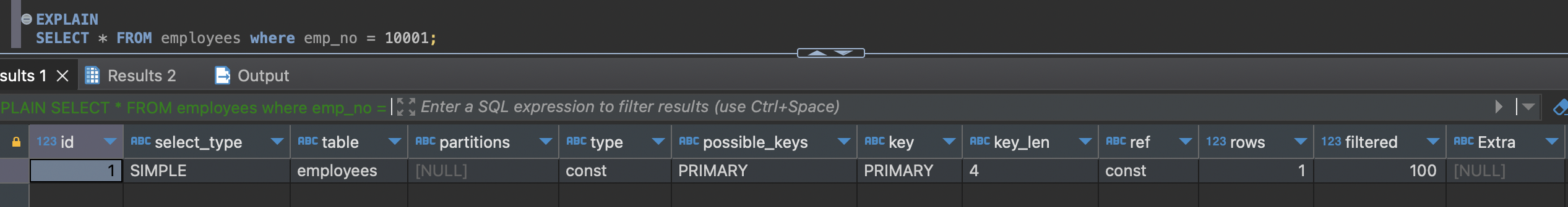 위 쿼리의 실행 계획을 보면 Extra 컬럼이 Using index 메시지를 출력한 것을 확인할 수 있다. 이 쿼리는 인덱스에 포함된 컬럼 id만으로 데이터 파일까지 갈 필요없이 인덱스로 처리가능하기 때문에 커버링 인덱스가 적용된 것이다.