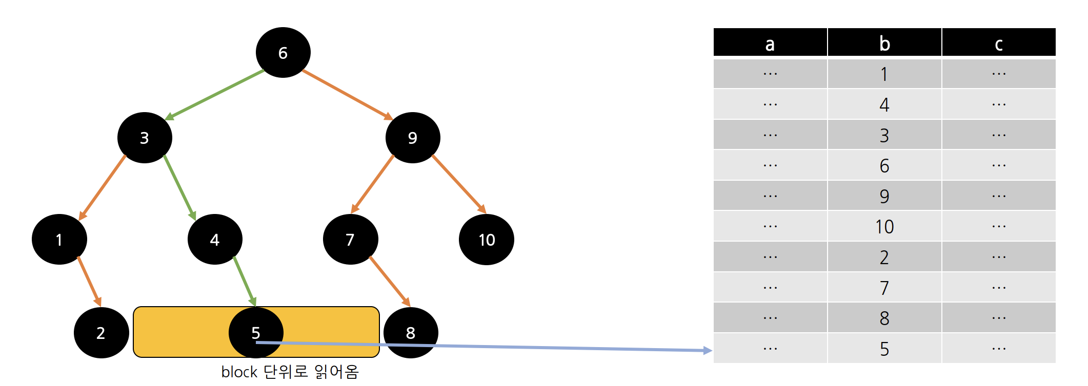 5차 B Tree 기반의 인덱스를 만들었을 때 5차 B Tree는 위와 같은 형태로 만들어진다. 똑같이 b가 5인 조건(where = 5)을 만족하는 데이터를 조회하면 루트 노드를 통해 4 보다는 크고 8보다는 작은 그 사이의 자식 노드로 이동하고, 해당 노드는 메모리 상에 올라와 있지 않기 때문에 디스크로부터 해당 데이터를 읽어 온다. 그리고 다시 5와 비교했을때, 5를 가지고 있기 때문에 인덱스에서의 조회는 끝나고, 마찬가지고 해당 데이터 포인터가 가리키고 있는 레코드 주솟값을 통해 디스크로부터 실제 데이터 파일의 정보를 읽어와 메모리 상으로 올린다. 이 과정에서는 디스크에 접근하는 과정이 두 번밖에 되지 않았다.