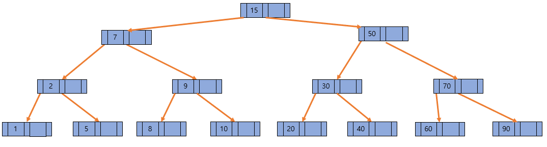 역시 마찬가지로 50을 승진시킴으로써 7, 15, 50에서 키가 넘치게 되고, 이 키를 15를 기준으로 7과 50을 분리한 다음 15를 승진시키면 마지막으로 15 키를 가진 노드에서 왼팔과 오른팔로 각각 7과 50 노드를 가리키면 아래와 같은 형태로 된다.