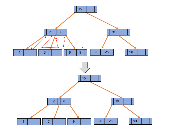 그 다음 7을 삭제한다고 가정해보자. 하지만 이 때는 이전과 다르게 형제의 지원을 받지 못한다. 따라서 부모의 지원을 받고 형제와 합칠 필요가 있다. 위 그림을 보면 2를 왼쪽 자식 노드로 이동하고, 7이 있던 노드와 합치려는데 7이 있던 노드는 합칠 키가 없으므로 그대로 삭제를 한다. 그 다음 부모 노드에서 8을 왼쪽으로 옮기면서 자신의 오른쪽 자식노드를 가리키는 포인터도 같이 이동시킨다. 그러면 3차 B Tree의 각 노드의 최소 key 수가 1개라는 조건을 유지하면서 데이터를 삭제했다.