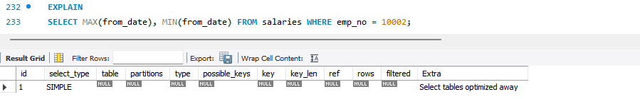 MIN() 또는 MAX()만 SELECT 절에 사용되거나 GROUP BY로 MIN(), MAX()를 조회하는 쿼리가 인덱스를 오름차순 또는 내림차순으로 1건만 읽는 형태의 최적화가 적용된다면, Extra 컬럼에 "Select tables optimized away"가 표시된다. 위 첫 번째 쿼리는 employees 테이블에 있는 emp_no 컬럼에 인덱스가 생성되어 있으므로 "Select tables optimized away" 최적화가 가능하다. 두 번째 쿼리는 salaries 테이블에 (emp_no, from_date)로 인덱스가 생성되어 있으므로 인덱스가 emp_no = 10002인 레코드를 검색하고, 검색된 결과 중에서 오름차순 또는 내림차순으로 하나만 조회하면 되기 때문에 최저고하가 가능하다.