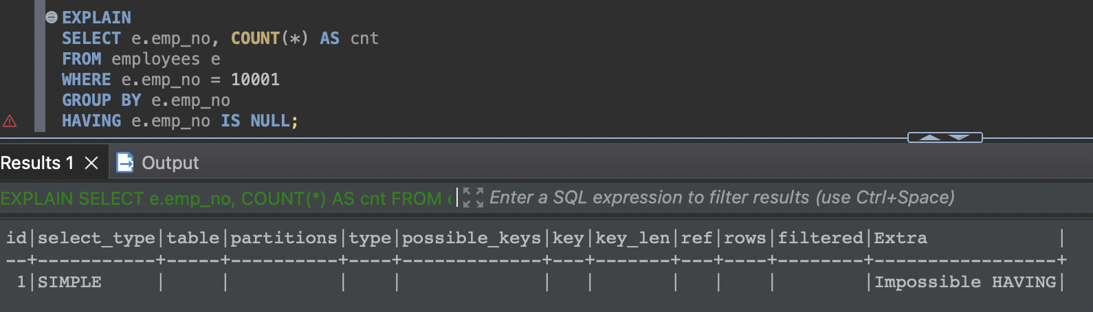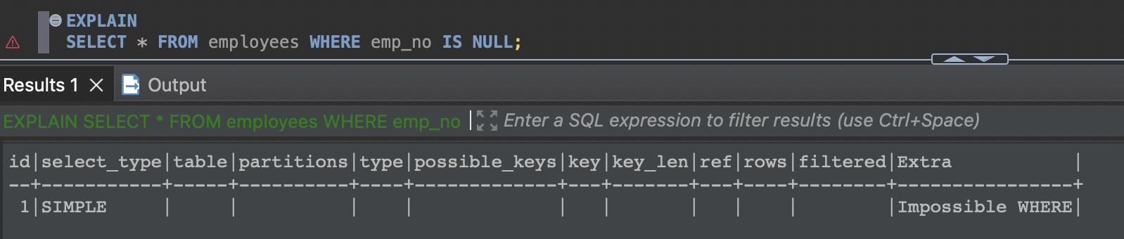 때로는 MySQL 서버에서 데이터 값이 아닌 쿼리 결괏값의 메타데이터만 필요한 경우도 있다. 즉, 쿼리의 결과ㅓ가 몇 개의 컬럼을 가지고, 각 컬럼의 타입은 무엇인지 등의 정보만 필요한 경우가 있다. 이런 경우에는 쿼리의 마지막에 "LIMIT 0"을 사용하면 되는데, 이때 MySQL 옵티마이저는 사용자의 의도(메타 정보만 조회하고자 하는 의도)를 알아채고 실제 테이블의 레코드는 전혀 읽지 않고 결괏값의 메타 정보만 반환한다. 이 경우 실행 계획의 Extra 컬럼에는 "Zero limit" 메시지가 출력된다.