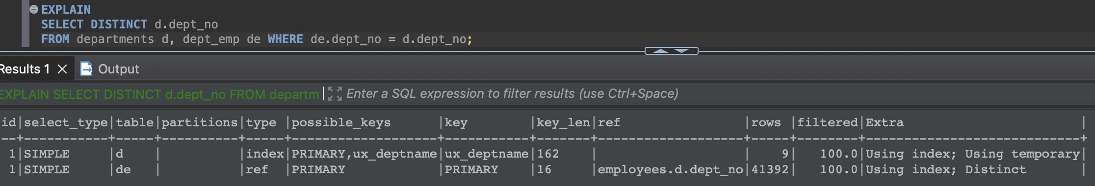 MySQL 서버에서 쿼리를 처리하는 동안 중간 결과를 담아 두기 위해 임시 테이블(Temporary table)을 사용한다. 임시 테이블은 메모리 상에 생성될 수도 있고 디스크상에서 생성될 수도 있다. 쿼리의 실행 계획에서 Extra 컬럼에 "Using temporary" 키워드가 표시되면 임시 테이블을 사용한 것이다.