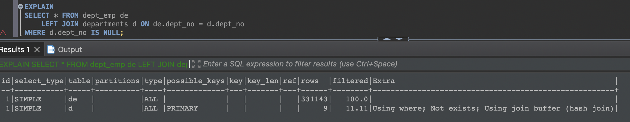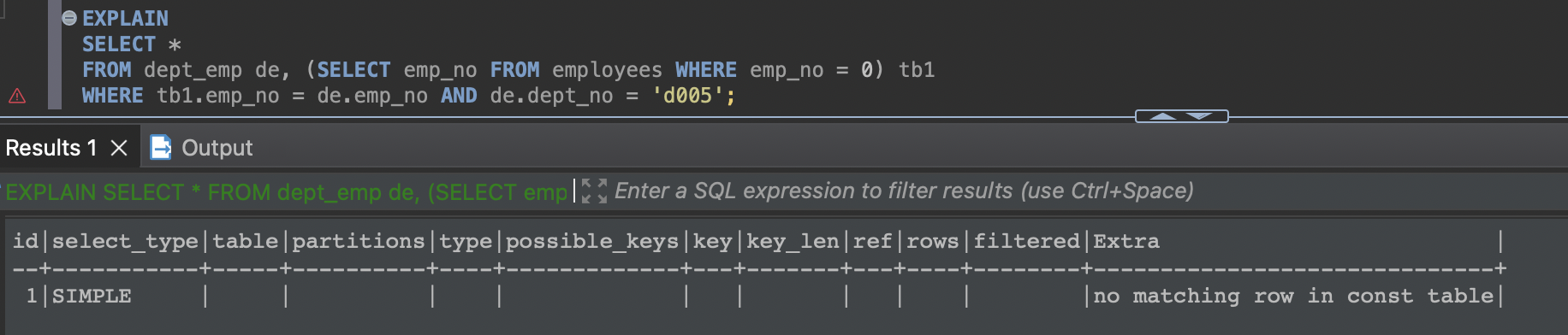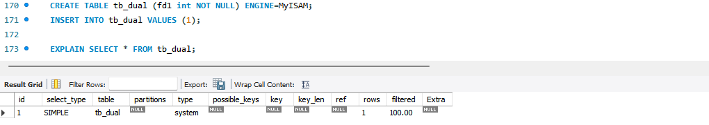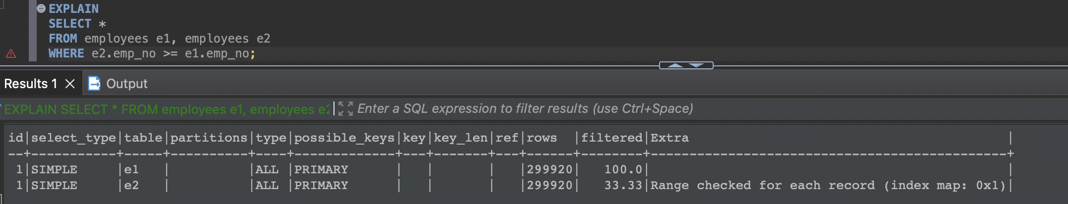 때로는 프라이머리 키로 한 건의 레코드만 조회해도 "Using where"가 출력되는 문제점도 있다. 그래서 실행 계획의 Extra 컬럼에 표시되는 "Using where"가 성능상의 문제를 일으킬지 아닐지를 적절히 선별하는 능력이 필요한데, MySQL 8.0에서는 실행 계획에 filtered 컬럼이 같이 표시되므로 쉽게 성능상의 이슈가 있는지 없는지 알아낼 수 있다. 이 실행 계획에서는 filtered 컬럼의 값이 50%인 것을 보면 옵티마이저는 100건 중에서 50건은 버려지고 최종 남은 50건이 반환될 것으로 예측했다는 것을 알 수 있다.