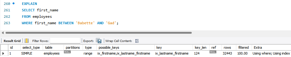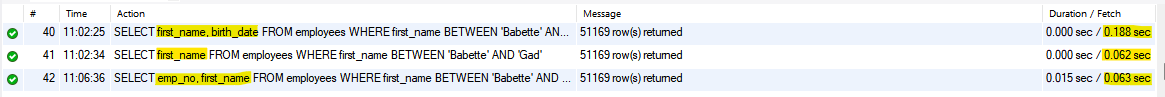 birth_date 컬럼은 빼고 first_name 컬럼만 SELECT하는 쿼리를 살펴보자. 이 쿼리는 풀 테이블 스캔이 아니라 인덱스를 통해서 필요한 레코드를 검색하고 필요한 컬럼(first_name)까지 인덱스에서 가져올 수 있으므로 데이터 파일을 읽어 올 필요가 없기 때문에 인덱스 레인지 스캔으로 처리된다는 것을 알 수 있다. 이 쿼리는 디스크에서 30~40개의 페이지만 읽으면 되기 때문에 매우 빠른 속도로 처리된다. 실제로 두 쿼리의 처리된 시간을 확인하면 대략 0.1초 정도 차이나는 것을 확인할 수 있고, InnoDB 테이블의 경우 클러스터링 인덱스로 구성되어 있기 때문에 first_name 컬럼으로 인덱스를 만들었지만 커버링 인덱스로 처리될 가능성이 높아 빠르게 first_name 컬럼만으로 조회한 것과 비슷한 처리속도를 보여준다.