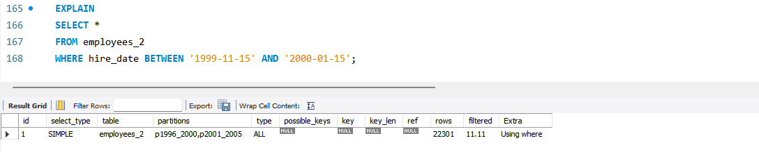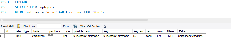 MySQL 옵티마이저가 인덱스 컨디션 푸시 다운(Index condition pushdown) 최적화를 사용하면 위 실행계획 Extra 컬럼에 "Using index condition" 메시지가 표시된다.