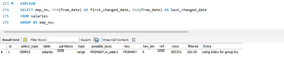 위 쿼리는 salaries 테이블의 (emp_no, from_date) 컬럼으로 만들어진 인덱스에서 emp_no 그룹별로 첫 번째 from_date 값(최솟값)과 마지막 from_date 값(최댓값)을 인덱스로부터 읽으면 되기 때문에 루스 인덱스 스캔 방식으로 처리할 수 있다. 그리고 GROUP BY에서 인덱스를 사용하려면 우선 GROUP BY 조건에서 인덱스를 사용할 수 있는 요건이 갖춰져야 한다. 하지만 그 이전에 WHERE 절에서 사용하는 인덱스에서도 GROUP BY 절의 인덱스 사용 여부가 영향을 받는다는 사실이 중요하다.