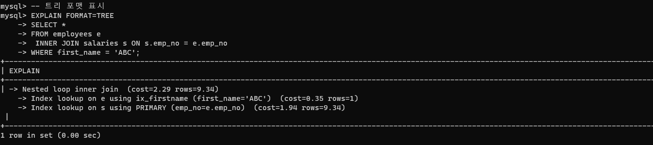 MySQL 8.0 버전부터는 FORMAT 옵션을 사용해 실행 계획의 표시 방법을 JSON이나 TREE, 단순 테이블 형태로 선택할 수 있다.
