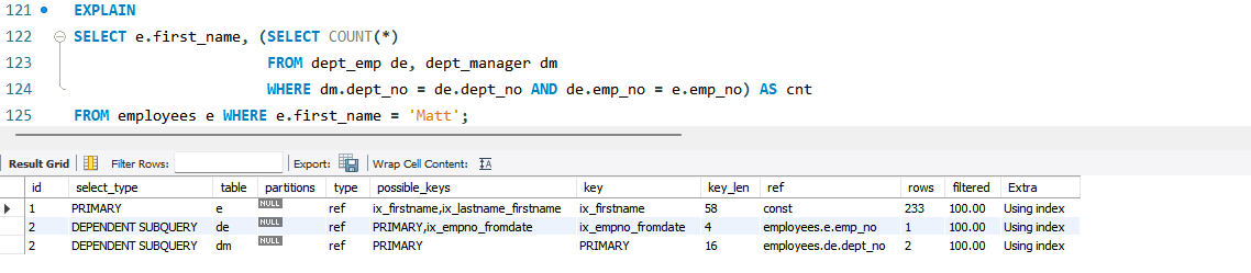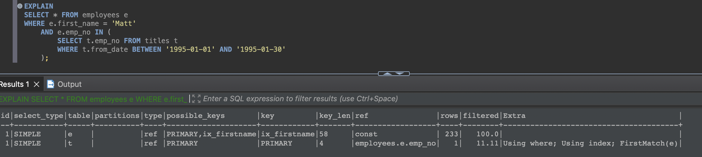 - employees 테이블의 ix_firstname 인덱스를 통해 first_name='Matt' 조건에 일치하는 레코드를 찾고