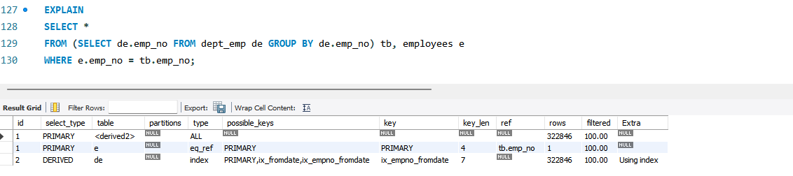위 실행 계획을 보면 employees 테이블의 레코드마다 salaries 테이블에서 emp_no가 일치하는 레코드 중에서 from_date 컬럼의 역순으로 2건만 가져와 임시 테이블 derived2로 저장했다. 그리고 employees 테이블과 derived2 테이블을 조인한다. 그런데 여기서 derived2 임시 테이블은 employees 테이블의 레코드마다 새로 내부 임시 테이블이 생성된다. 이렇게 매번 임시 테이블이 새로 생성되는 경우 Extra 컬럼에는 Rematerialize 문구가 표시된다.