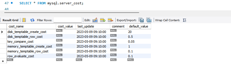 - cost_value: DBMS 관리자가 설정한 값(이 값이 NULL이면 MySQL 서버는 default_value 컬럼의 비용 사용)