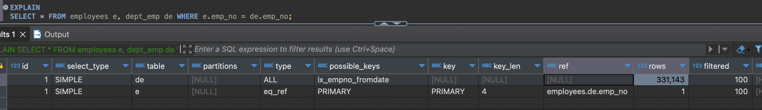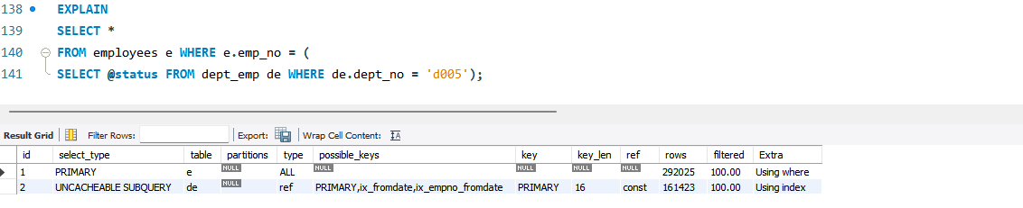 - rows=9.53: employees 테이블에서 읽은 emp_no에 일치하는 salaries 테이블의 평균 레코드 건수를 의미한다.