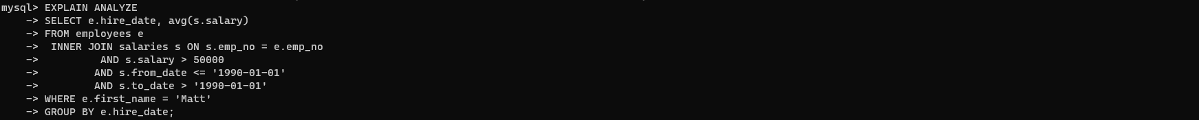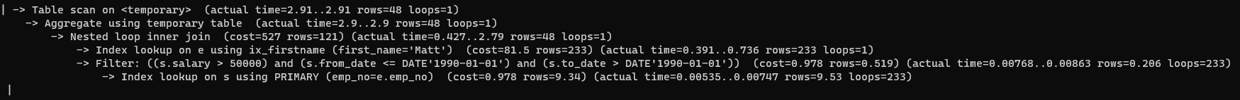- actual time=0.00535..0.00747: employees 테이블에서 읽은 emp_no 값을 기준으로 salaries 테이블에서 일치하는 레코드를 검색하는데 걸린 시간(밀리초)을 의미한다. 첫 번째는 평균 시간, 두 번째는 마지막 레코드를 가져오는데 걸린 평균 시간를 의미한다.