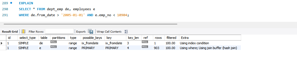하지만 조인이 수행될 때 드리븐 테이블에 검색을 위한 적절한 인덱스가 없다면 MySQL 서버는 블록 네스티드 루프 조인이나 해시 조인을 사용한다. 블록 네스티드 루프 조인이나 해시 조인을 사용하면 MySQL 서버는 조인 버퍼를 사용한다. 실행 계획에서 조인 버퍼가 사용되는 실행 계획의 Extra 컬럼에는 "Using join buffer"라는 메시지가 표시된다.