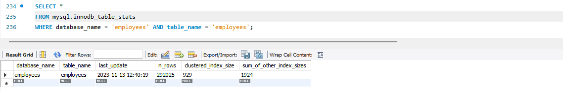 - innodb_table_stats.clustered_index_size: 프라이머리 키의 크기(InnoDB 페이지 개수)