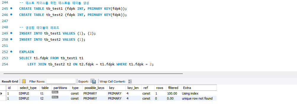 이 쿼리가 실행되면 tb_test2 테이블에는 fdpk = 2인 레코드가 없으므로 다음처럼 "unique row not found"라는 코멘트가 표시된다.