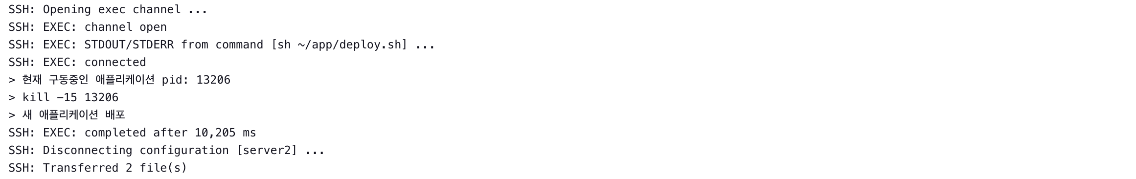 만약 구동중인 애플리케이션이 있다면 해당 애플리케이션을 종료한 후 재시작하도록 배포 자동화 과정까지 모두 성공한 것을 확인할 수 있다!