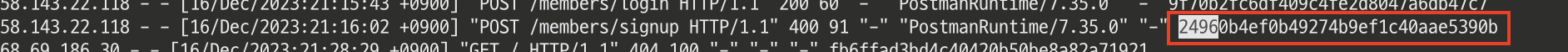 Nginx에서 제공하는 $request_id 변수값을 사용하여 Nginx 로그 파일에서도 WAS 로그 파일에서도 모두 같은 식별자가 로깅되는 것을 확인할 수 있다.