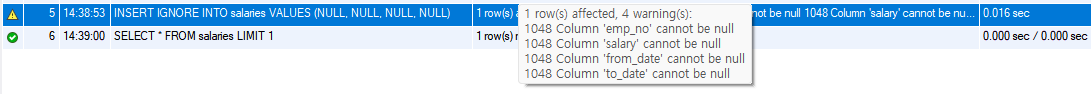 INSERT IGNORE 옵션은 단순히 유니크 인덱스의 중복뿐만 아니라 데이터 타입이 일치하지 않아서 INSERT를 할 수 없는 경우에도, 위 예제처럼 INSERT를 하도록 만들 수 있다. 이 경우에는 NOT NULL 컬럼에 NULL이 입력되어 NULL 대신 숫자 컬럼의 기본 값이 0을 INSERT를 한 것이다.