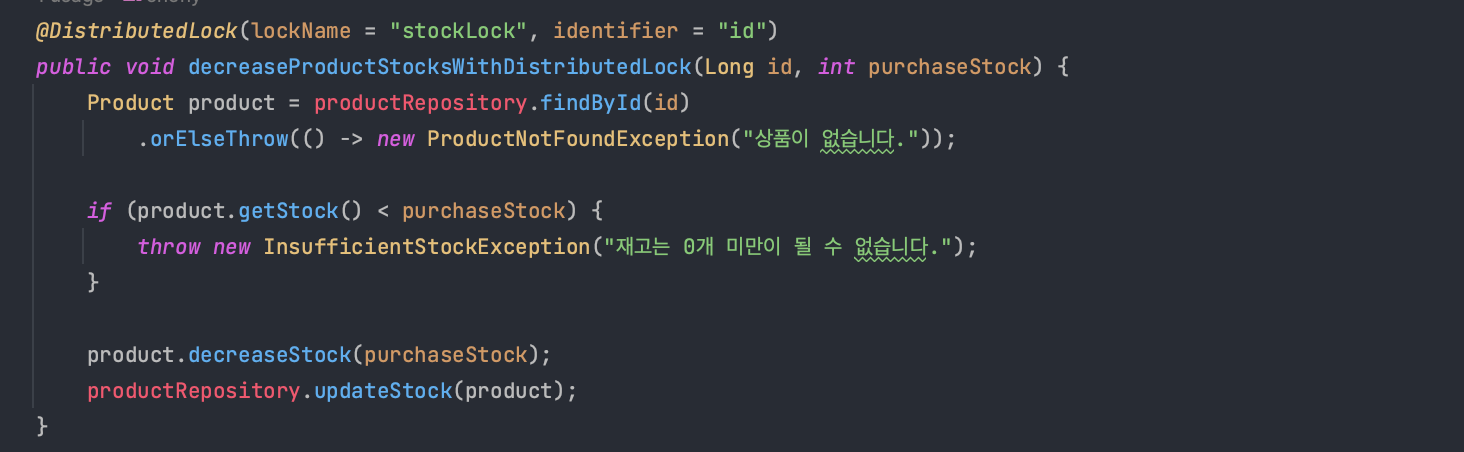 상품 관련 서비스에서 재고차감에 대한 비즈니스 로직을 작성하고 @DistributedLock 어노테이션을 적용한 것을 확인할 수 있다. 재고차감에 대한 로직은 먼저 상품을 조회한 다음 재고를 확인하여 재고 차감 시 0개 미만이 안되는 경우에만 재고를 차감시킬 수 있도록 로직을 작성했다.