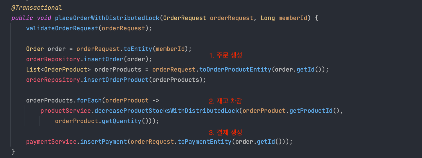 -> 분산 락 반납 -> 결제 생성 -> 주문 트랜잭션 종료