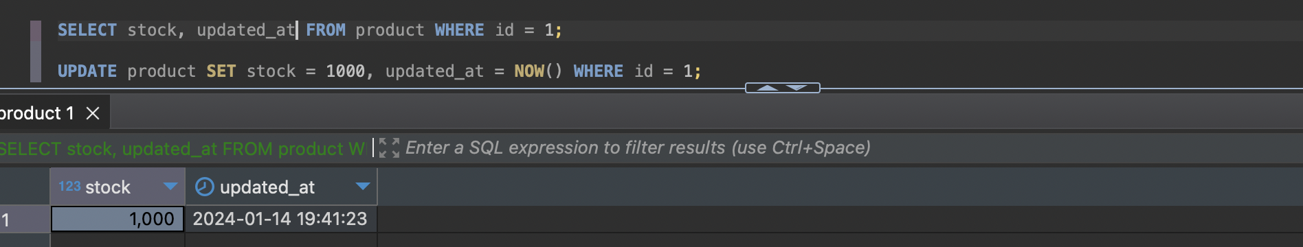 소스 서버에서 상품 테이블에서 id가 1인 상품의 재고를 1,000개로 수정해줬다.