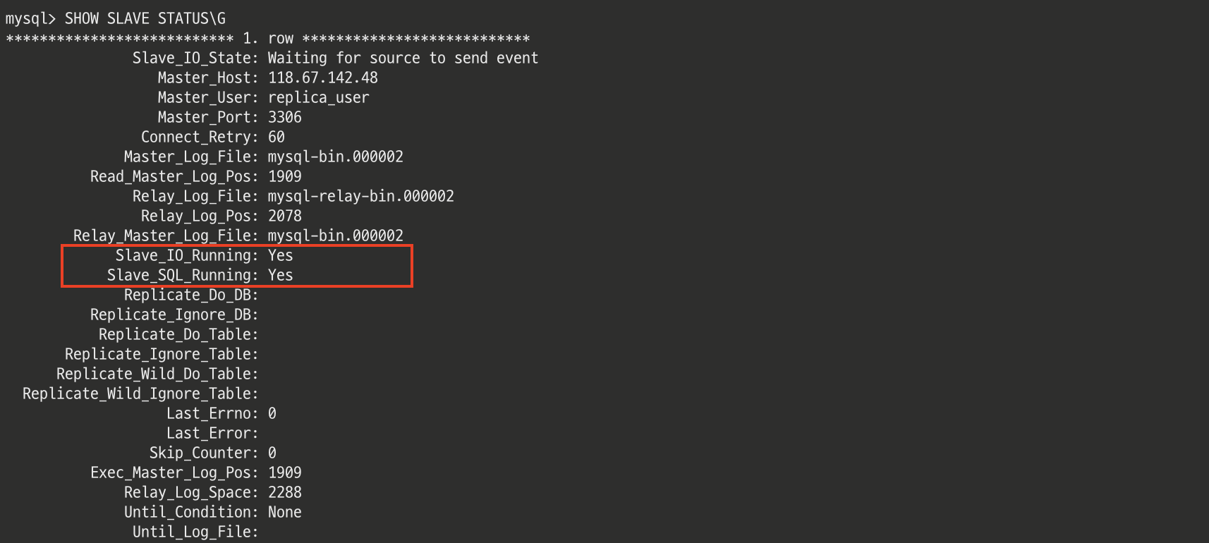 그리고 레플리카 서버 상태를 확인하면 Slave IO와 Slave SQL이 모두 정상적으로 동작하는 것을 확인할 수 있다.