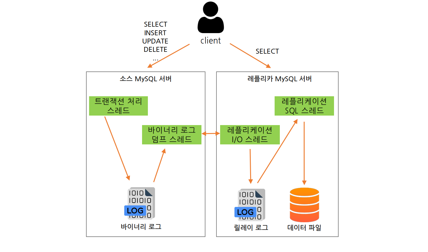 MySQL 서버에서 발생하는 모든 변경 사항은 별도의 로그(Binary Log)라고 한다. 바이너리 로그에는 데이터의 변경 내역뿐만 아니라 데이터베이스나 테이블의 구조 변경과 계정이나 권한의 변경 정보까지 모두 저장된다. MySQL 복제는 이 바이너리 로그를 기반으로 구현됐는데, 소스 서버에서 생성된 바이너리 로그가 레플리카 서버로 전송되고 레플리카 서버에서는 해당 내용을 로컬 디스크에 저장한 뒤 자신이 가진 데이터에 반영함으로써 소스 서버와 레플리카 서버 간에 데이터 동기화가 이루어진다. 레플리카 서버에서 소스 서버의 바이너리 로그를 읽어 들여 따로 로컬 디스크에 저장해둔 파일을 릴레이 로그(Relay Log)라고 한다. MySQL의 복제는 세 개의 스레드에 의해 작동하는데, 이 세 스레드 중 하나는 소스 서버에서, 나머지 두 개의 스레드는 레플리카 서버에 존재한다. 각 스레드의 역할은 다음과 같다.