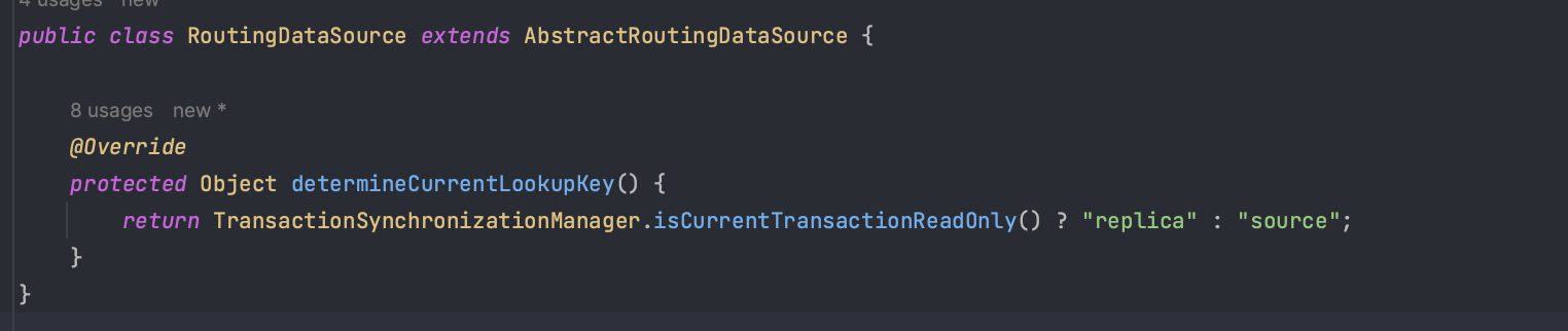 현재 한 개의 DataSource를 이용하고 있지만 이중화를 했기 때문에 두 개의 DataSource에 각각 쿼리를 보내줘야 한다. 이를 위해 AbstractRoutingDataSource 클래스에 determineCurrentLookupKey를 이용하여 Source나 Replica 중 사용할 DataSource를 라우팅할 수 있다. 위처럼 ThreadLocal 변수를 이용하여 현재 스레드에서 사용할 DataSource를 demetineCurrentLookupKey 메서드에서 정의할 수 있다.