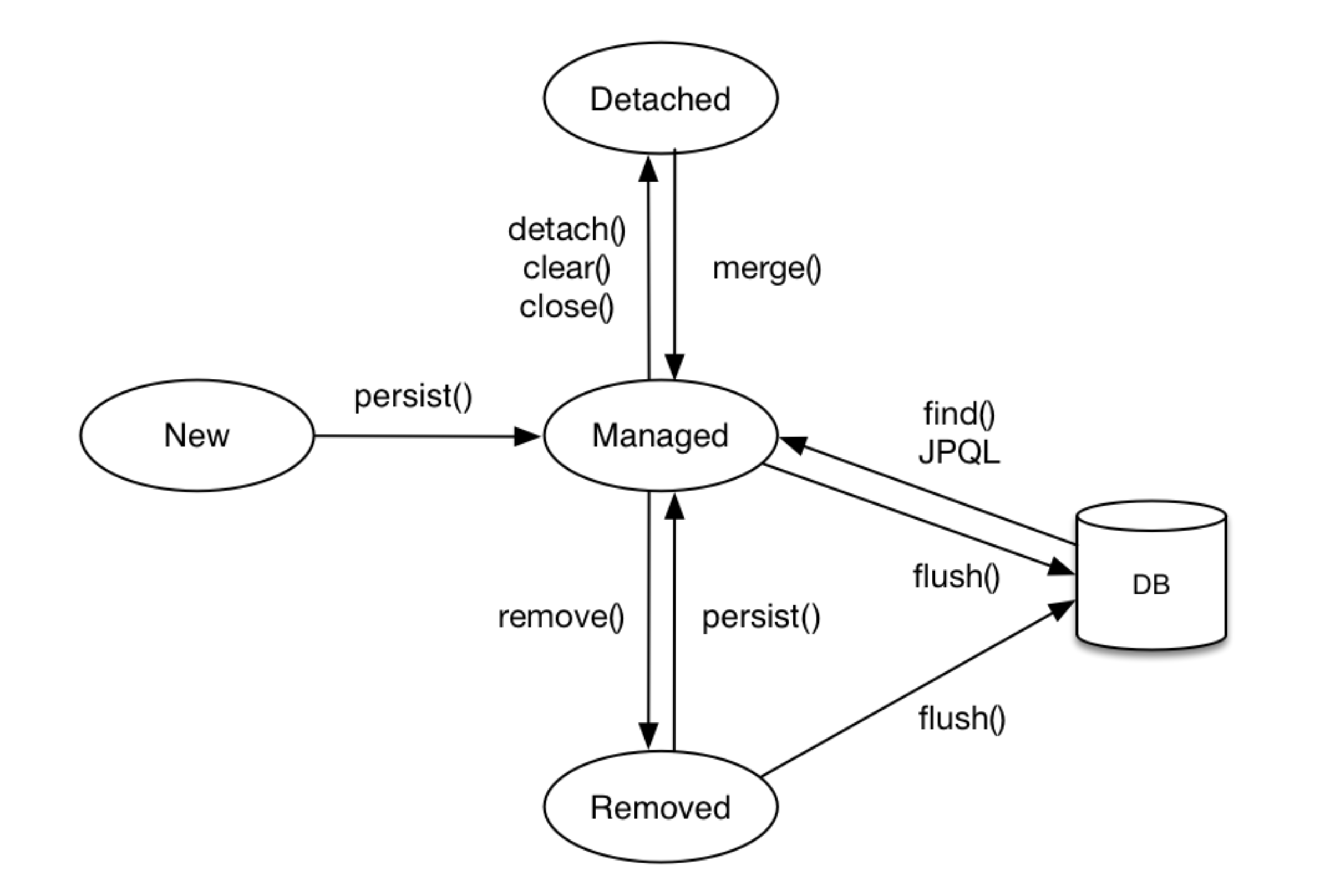 JPA의 엔티티 생명주기는 엔티티가 존재하는 동안의 상태로 다음과 같은 네 가지 상태로 분리할 수 있다.