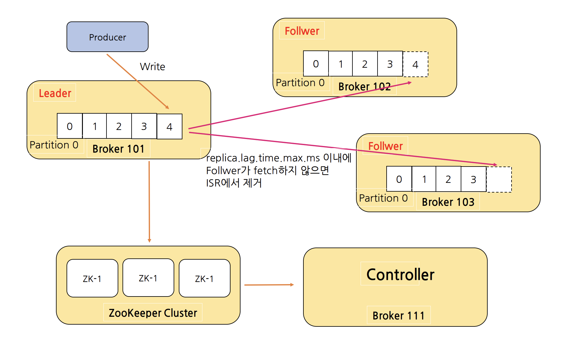 - offset 3까지 복제가 완료되어 있는 상황에서 Producer가 메시지를 보내면 Leader가 offset 4에 새 메시지를 추가한다.