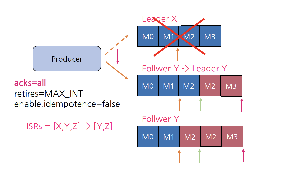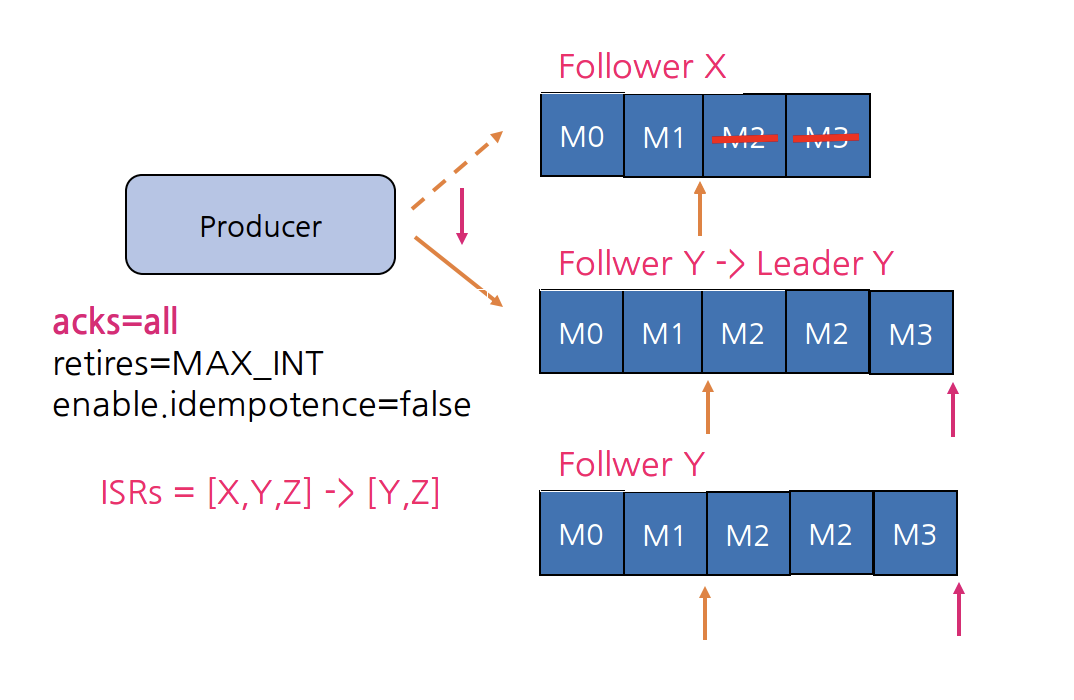 Producer는 M2, M3 메시지에 대한 ack를 받지 못했으므로 Broker Y로 메시지를 보내게 되면 idempotence=false이기 때문에 M2는 중복이 발생한다. 그리고 Broker Z는 M3, M4를 fetch하고, 다시 fetch를 수행해서 High Water Mark(빨강 화살표)를 수신한다.
