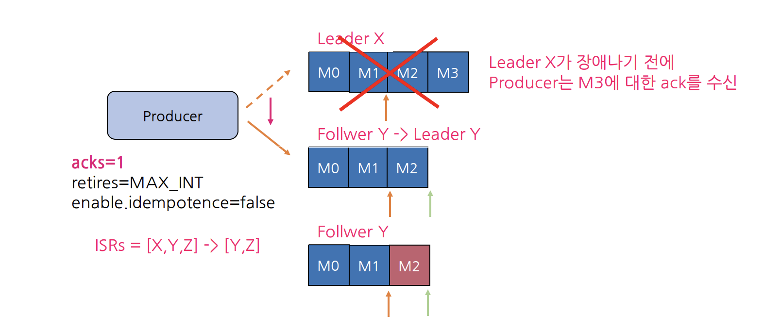 위 그림처럼 Partition이 3개의 Replica로 구성되어 있고, Producer가 4개의 메시지(M0, M1, M2, M3)를 보냈다고 가정해보자. 메시지 M1, M2가 ISR 리스트 전체에 복제되었고 Commit(주황 화살표)되었고, Broker Y는 M3를 복제했지만 Commit을 못한 상태, Broker Z는 M2까지만 복제한 상태이다.