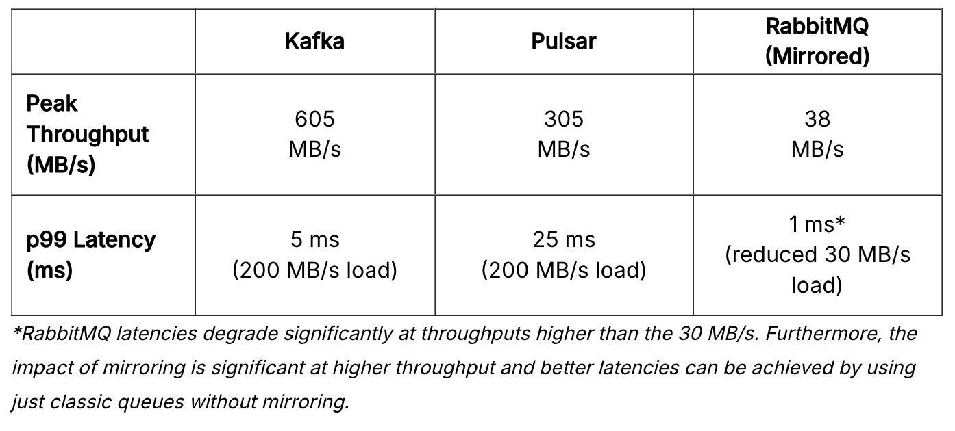 Kafka와 RabbitMQ 둘 다 메시지 전송 플랫폼을 제공하지만 위 그래프에서도 볼 수 있듯이 카프카가 초당 600MB로 처리량이 훨씬 높은 것을 확인할 수 있다. Kafka는 순차 디스크 I/O를 사용하여 처리량이 높은 메시지를 교환할 수 있으므로 초당 수백만 개의 메시지를 전송하지만, RabbitMQ는 초당 수 천 개의 메시지를 전송할 수 있어 초당 수백만 개의 메시지를 보내려면 브로커가 여러 개 필요하다.
