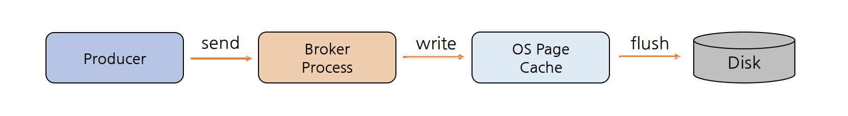 Kafka에서는 마지막 flush 이후의 메시지 수(log.flush.interval.messages) 또는 시간(log.flush.interval.ms)으로 flush(fsync)를 트리거할 수 있도록 설정할 수 있다. 하지만 Kafka는 운영 체제의 background Flush 기능(pdflush)을 더 효율적으로 허용하는 것을 선호하기 때문에 이러한 설정은 기본값으로 무한(fsync 비활성화)으로 설정하는 것을 권장한다.