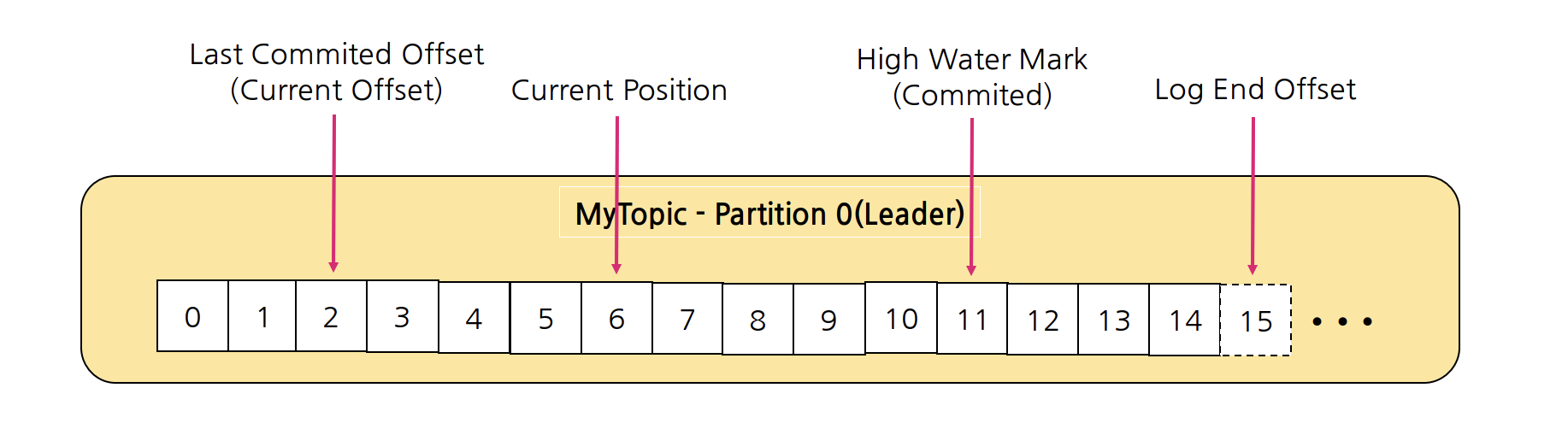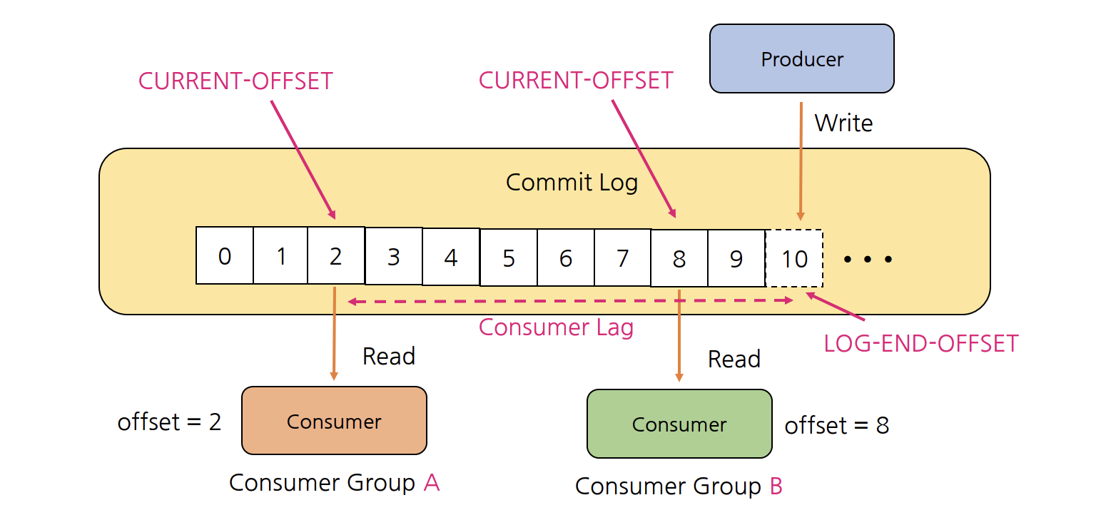 - Last Commited Offset(Current Offset): Consumer가 최종 Commit한 Offset