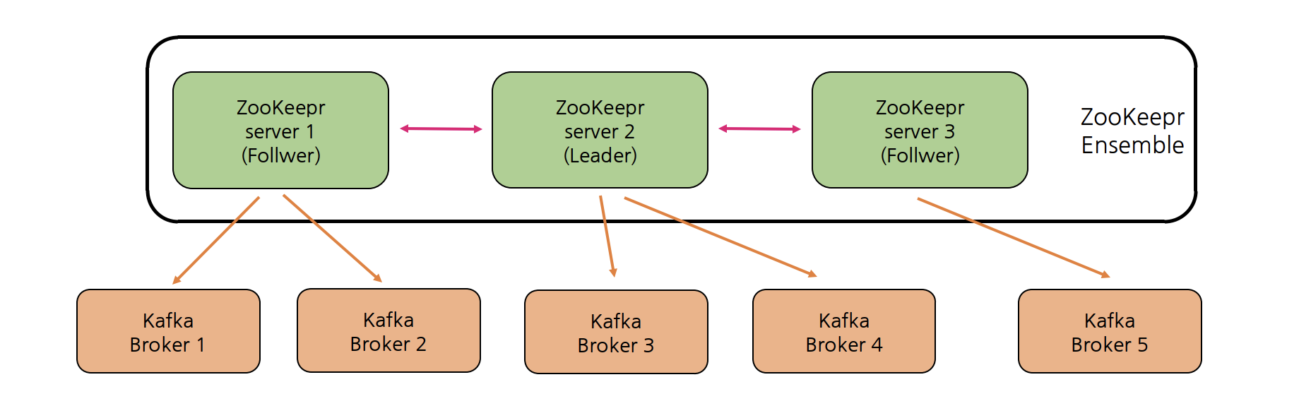 ZooKeeper는 분산형 Configuration 정보 유지, 분산 동기화 서비스를 제공하고 대용량 분산 시스템을 위한 네이밍 레지스트리를 제공하는 서버로 ZooKeeper를 사용하여 멀티 Kafka Broker들 간의 정보(변경 사항 포함) 공유, 동기화 등을 수행할 수 있다. 위 그림처럼 Leader/Follwer 기반의 Master/Slave 아키텍처로 구성되어 예상치 못한 장애가 발생해도 Quorum 알고리즘 기반을 통해 분산 시스템의 일관성을 유지시키기 위해 사용한다.