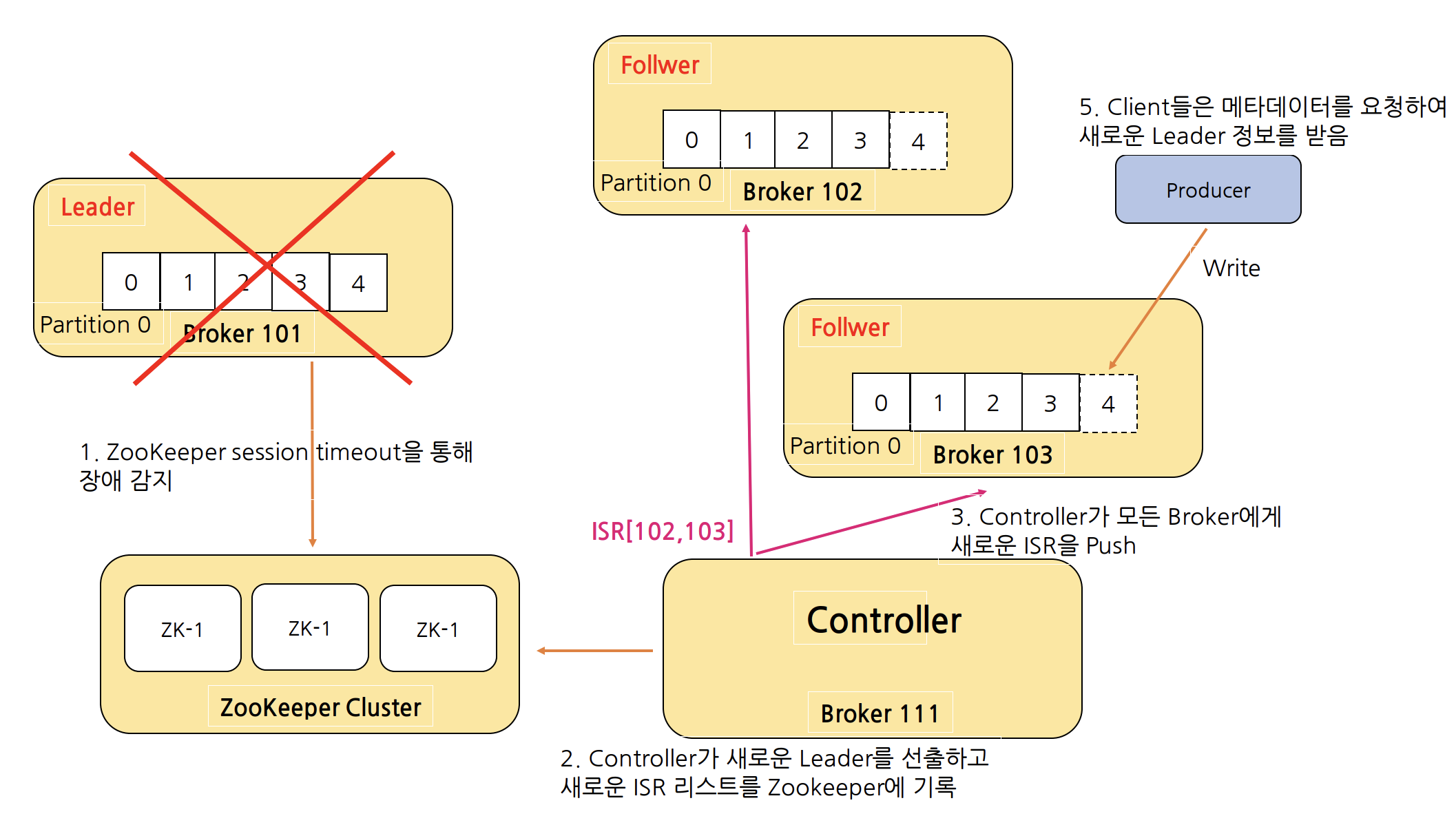 위 그림처럼 Follwer가 너무 느리거나 장애가 나는 경우 Leader는 ISR에서 Follwer를 제거하고 ZooKeeper에 ISR을 변경 목록을 알려준다. ZooKeeper에서는 Partition Metadata에 대한 변경 사항을 기록한 후 Controller에게 이를 알려준다. Leader가 장애가 나는 경우에는 위에서 설명했듯이 Controller가 새로운 Leader를 선출하고, ISR 정보를 업데이트하여 ZooKeeper에 기록한 다음 클라이언트 메타데이터 업데이트를 위해 모든 Broker에 전파한다.