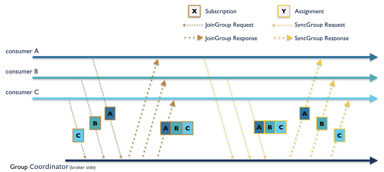 처음은 Subscription 과정으로 Consumer들이 JoinGroup 요청을 Group Coordinator에 보내면 리밸런싱이 시작되며, JoinGroup의 응답이 Consumer들에 전송된다. 모든 구성원은 Broker에 SyncGroup 요청을 보내야 하며, Group Leader는 각 Consumer의 Partition 할당을 계산해서 Group Coordinator에게 전송하면 Broker는 SyncGroup 응답에서 각 Consumer별 Partition 할당을 보낸다. 오랫동안 사용되었던 Eager Rebalancing 프로토콜 방식은 각 구성원이 JoinGroup 요청을 보내고, 재조정에 참여하기 전에 소유한 모든 Parition을 취소해야 하기 때문에 안전면에서는 좋지만 재조정 기간 동안 작업을 수행할 수 없다는 단점이 있다. 따라서 이를 보완하기 위해 재종이 필요한 Partition만 revoke하는 Incremental Cooperative Rebalancing Procotol이 나오게 되었다.