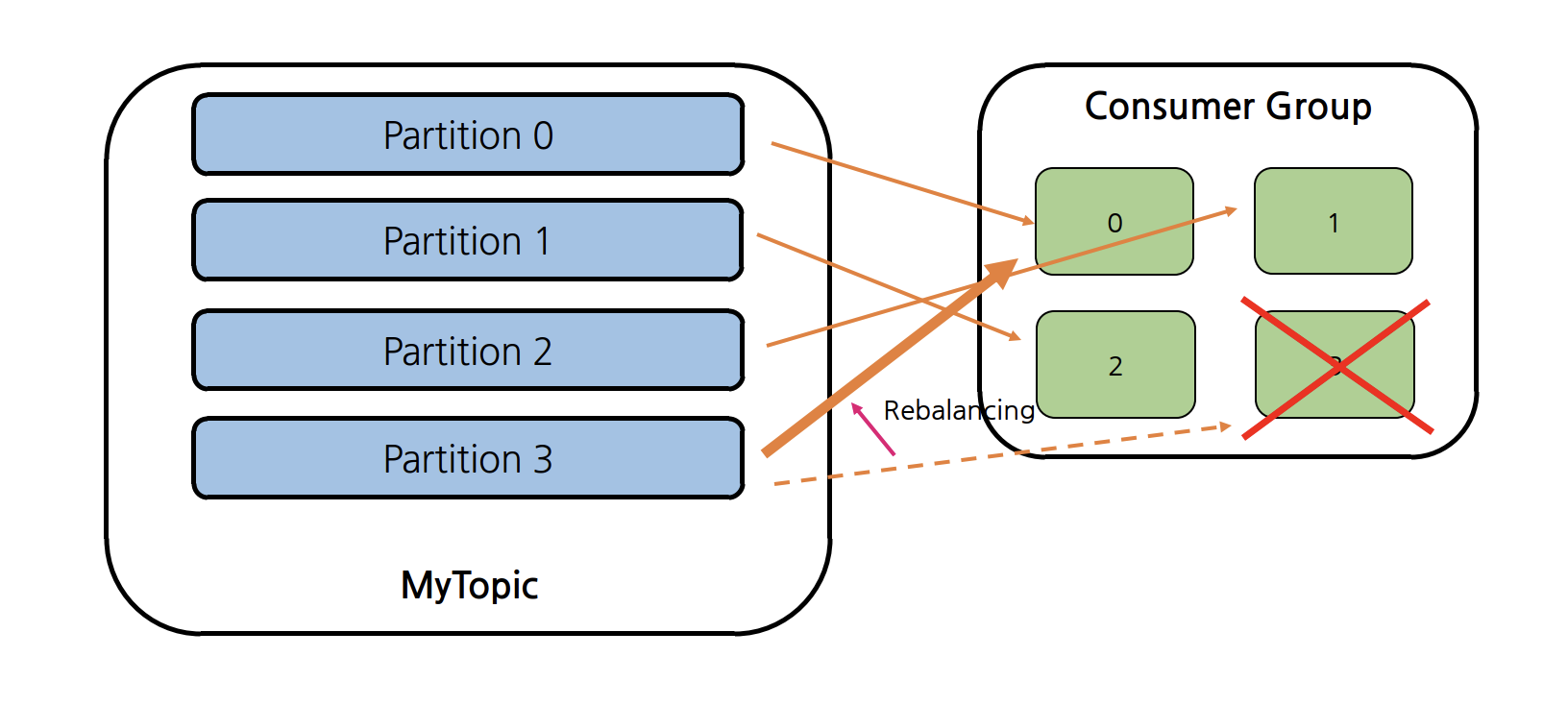 위 그림처럼 4개의 파티션이 Topic를 consume하는 4개의 Consumer가 하나의 Consumer Group에 있다면, 각 Consumer는 정확히 하나의 Partition에 Record를 consume한다. 하지만 만약 하나의 Consumer에 장애가 생겨 메시지를 consume할 수 없는 상황이 발생한다면 Consumer는 주어진 Topic에 1개 이상의 많은 Partition을 사용할 수 있기 때문에 Rebalancing 작업을 통해 Partition으로 오는 Record를 consume할 수 있도록 한다.