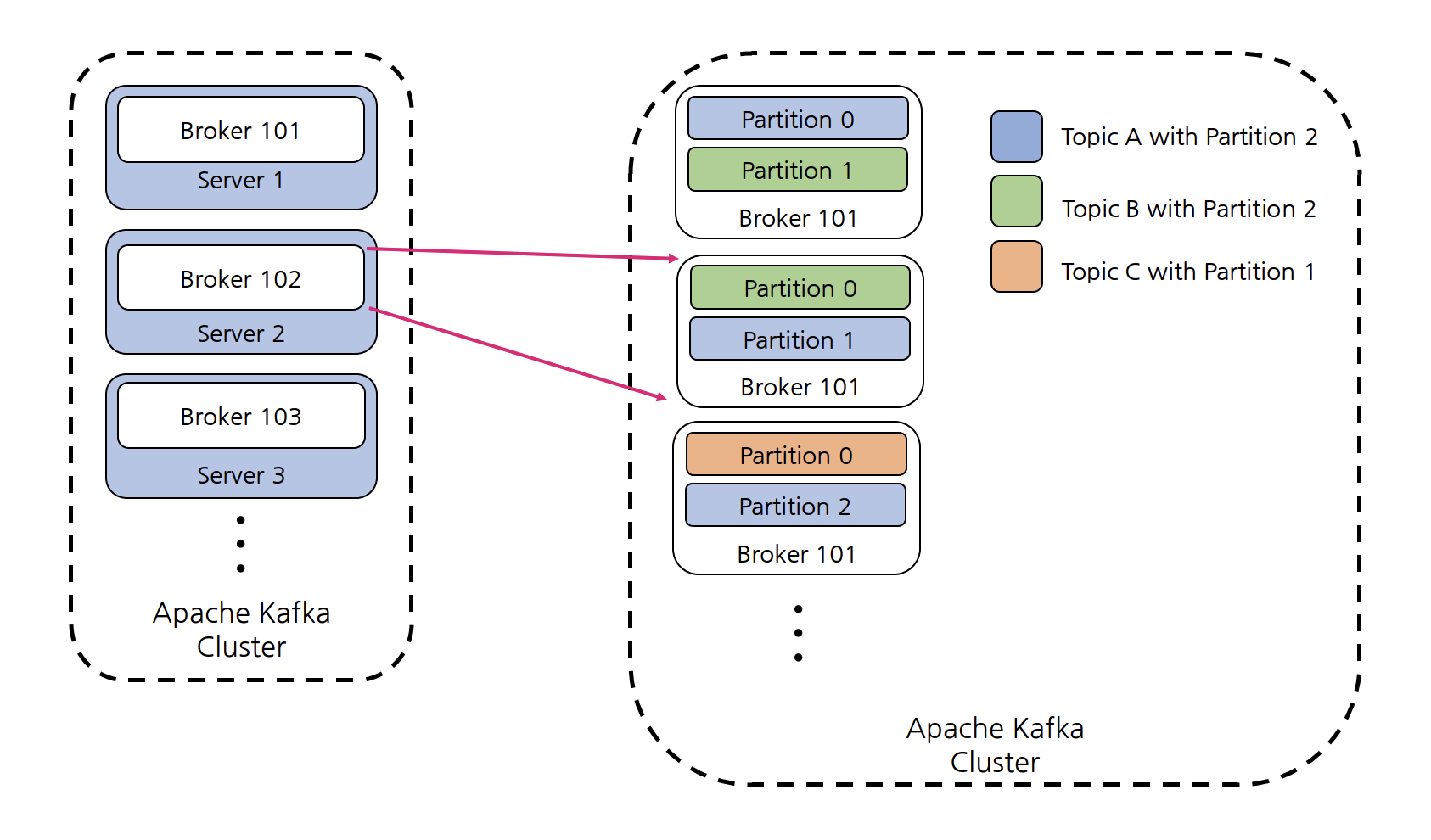 Kafka Broker는 Partition에 대한 Read 및 Write를 관리하는 컴포넌트이다. Kafka Server라고 부르기도 하는데 Topic을 구성하는 Partition들은 여러 Broker 상에 분산되엉 있다. 즉, Topic 생성 시 Kafka가 자동으로 Topic을 구성하는 전체 Partition들을 모든 Broker에게 할당해주고 분배하기 때문에 위 그림처럼 Topic 데이터의 일부분(Partition)을 갖을 뿐 데이터 전체를 갖고 있지 않다.