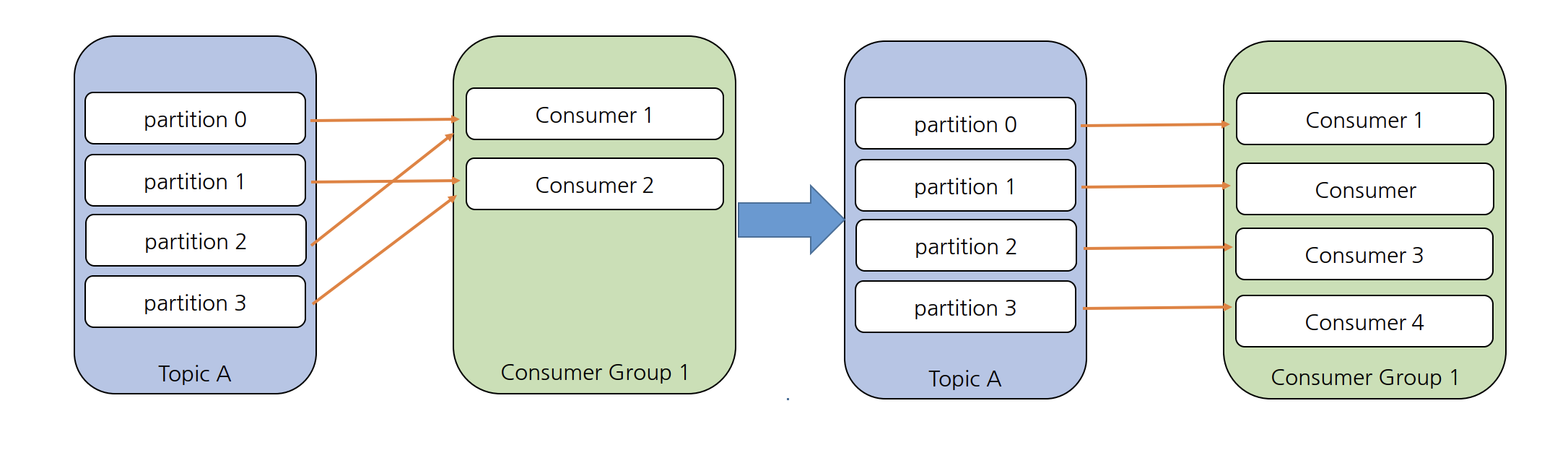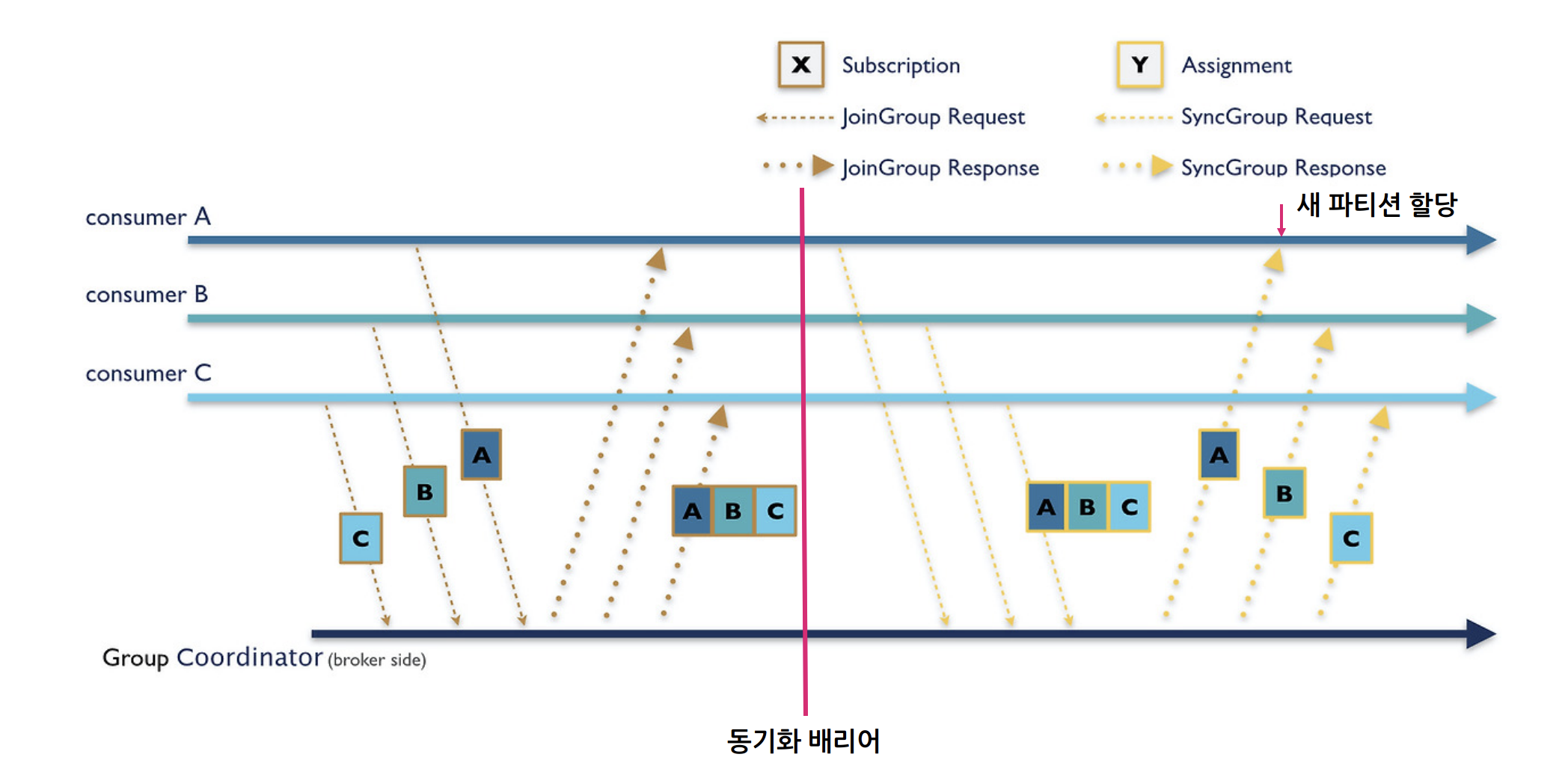 컨슈머는 컨슈머 그룹이 있듯이 브로커 내에 그룹의 상태를 관리하는 컨슈머 코디네이터(Consumer Coodinator)가 있다. 그룹 코디네이터는 컨슈머들의 Join Group 정보, 파티션 매핑 정보 등을 관리하고 컨슈머들의 하트비트를 관리한다. 컨슈머 그룹 내에 새로운 컨슈머가 추가/종료되거나 토픽에 새 파티션을 추가하는 경우 그룹 코디네이터는 컨슈머들에게 리밸런싱(Rebalancing)을 수행하도록 지시하여 메시지를 읽는 작업을 중지하고 리밸런싱에 집중한다. 리더 컨슈머는 파티션 할당 전략에 따라 컨슈머들에게 파티션을 할당한다.