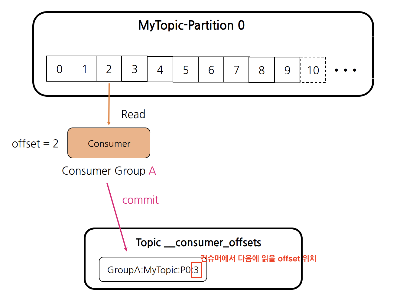 카프카에서는 파티션에서의 현재 위치를 업데이트하는 작업을 오프셋 커밋(offset commit)이라고 한다. 카프카에 특수 토픽인 __consumer_offset 토픽에 각 파티션별로 커밋된 오프셋을 업데이트하도록 하는 메시지를 보냄으로써 이루어진다. 모든 컨슈머들이 정상적으로 실행중일 때는 아무런 영향을 주지 않지만 컨슈머가 그룹에 추가/제외될 경우 리밸런스되면 각각의 컨슈머는 리밸랜스 이전에 처리하고 있던 것과는 다른 파티션들을 할당받을 수 있는데 이 때 컨슈머는 각 파티션의 마지막으로 커밋된 메시지를 읽어온 뒤 거기서부터 처리를 재개한다.