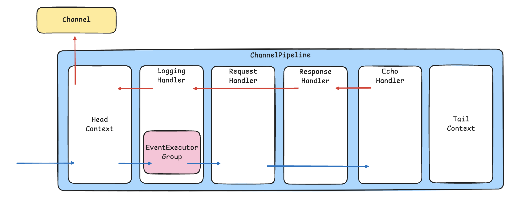 위 코드에서 생성한 ServerSockerChannel 객체에 채널 파이프라인을 등록한 것을 확인할 수 있다. 그러면 EventLoop에 Channel이 등록(register)된 후에 Channel의 관심있는 IO 이벤트가 발생하면 Selector를 통해 계속 감시하다 이벤트가 준비되면 Channel이 가지고 있는 ChannelPipeline을 사용하여 pipeline을 실행한다.