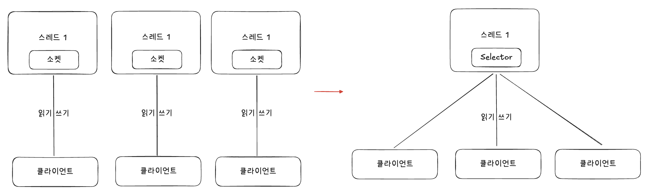 위 코드는 한 번에 한 연결만 처리한다. 어플리케이션이 read system call을 호출하면 kernel이 응답을 돌려줄 때까지 아무것도 할 수 없다. 즉, Blocking으로 동작하기 때문에 다수의 동시 클라이언트를 관리하려면 각 새로운 클라이언트 Socket마다 새로운 Thread를 할당해야 한다. 하지만 I/O 요청이 발생할 때마다 스레드를 새로 할당하면 스레드를 생성 및 관리하는 비용과 컨텍스트 스위칭으로 인한 CPU 자원이 소모된다.
